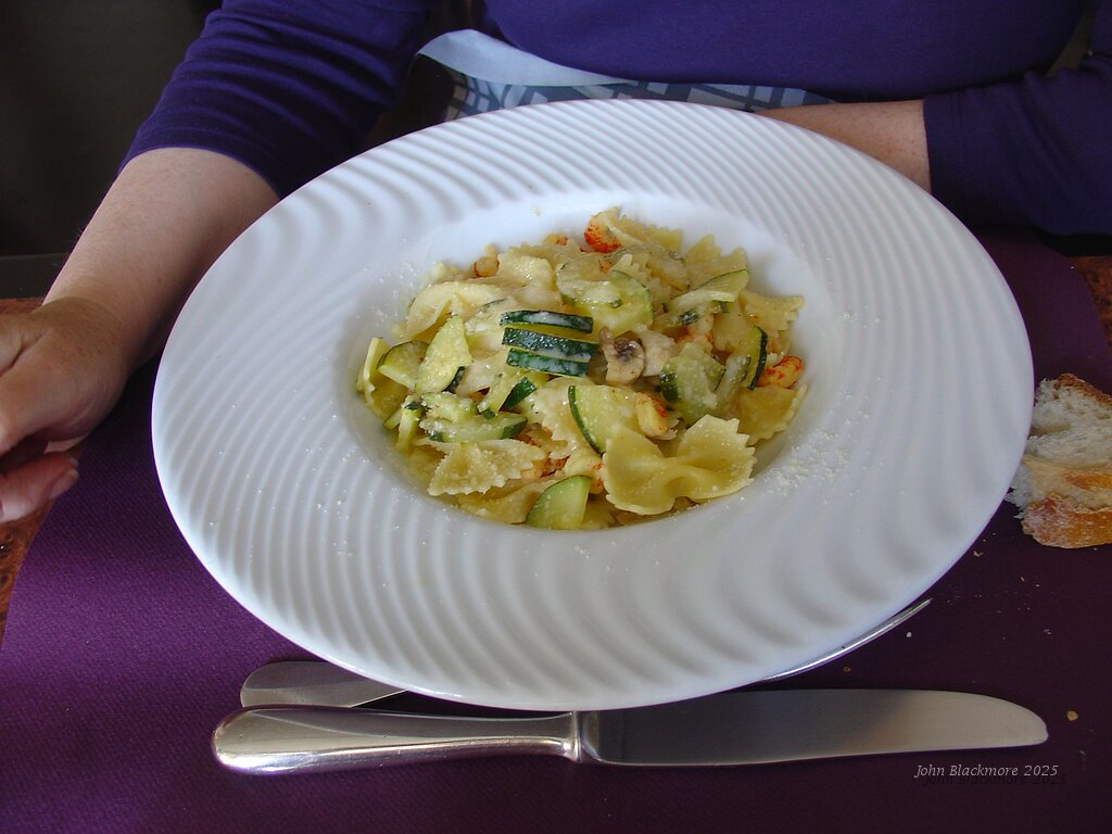 Farfalles aux queues d'ecrevisses, comcombres, champignons, beurre a l'orange