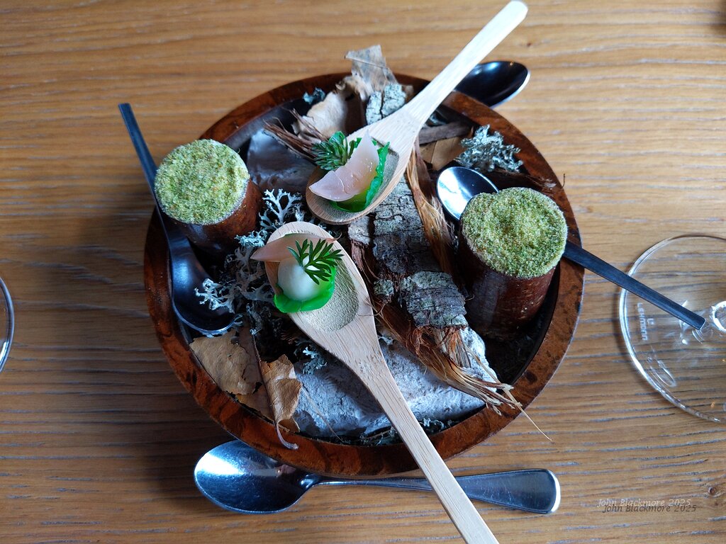 Amuse bouche 1: cream cheese with Brussels sprouts and radish (wooden spoon) and sapin ice in wood log