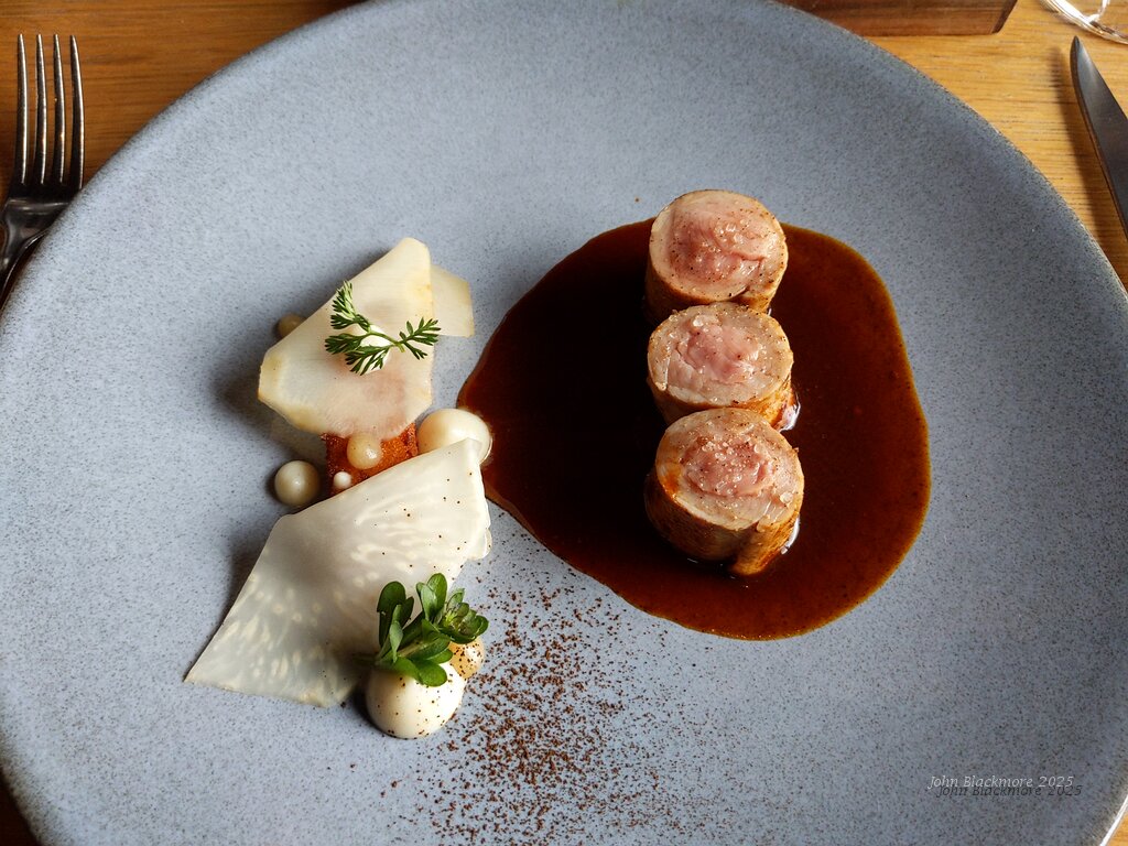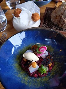 first course: Daguet (brocket deer) cromesquis, tartare, betterave chioggia, pomme - hot deer ball with cold pickled root vegetables, funghi and grapes