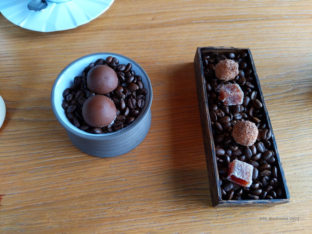 mignardises with coffee: chocolate spheres filled with cinnamon-flavoured crème anglaise, quetsche jellies and almond beignets