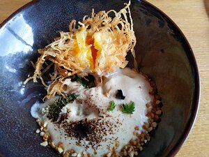 second course: L'oeuf crousti-coulant, racine persil, café, praliné