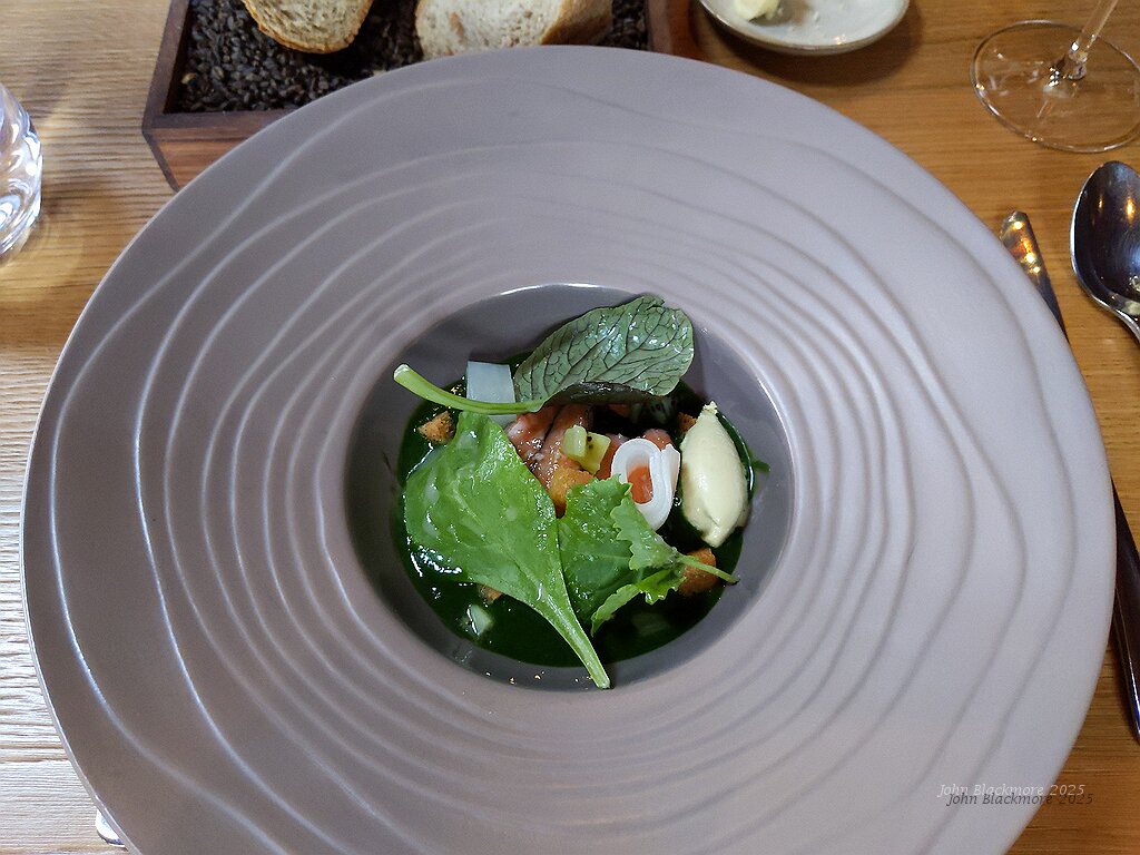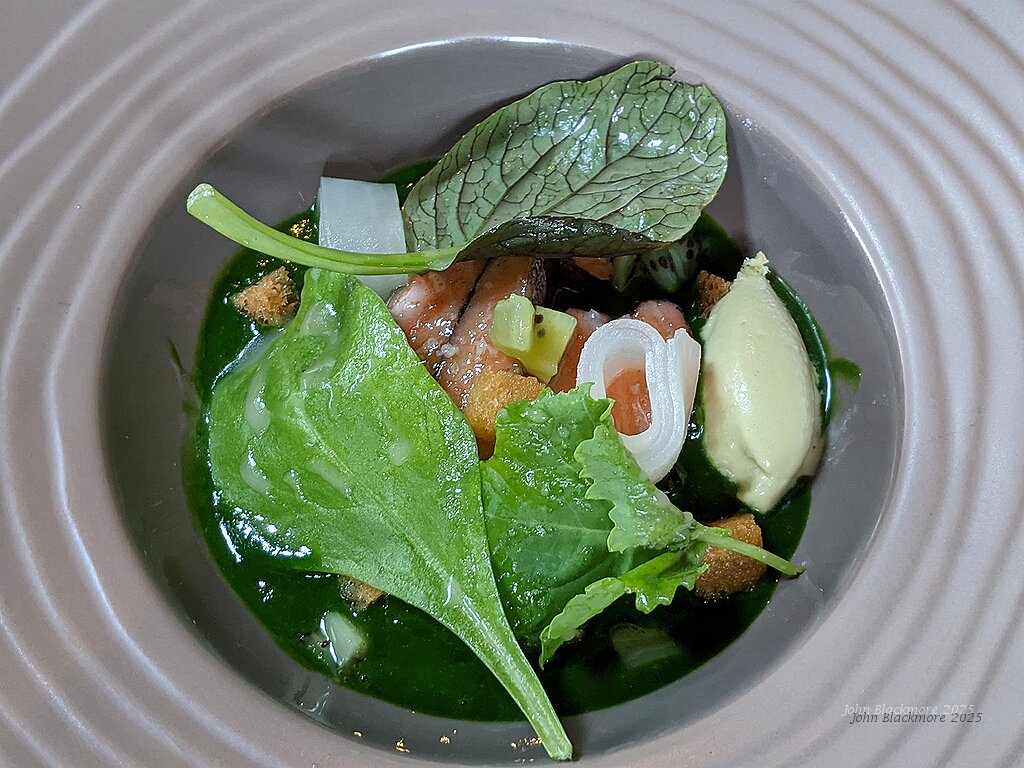 20201015_PXL111812625.PORTRAIT_Pixel3a-JEB La truite mi-cuite / Epinard / Kiwi (cubes) / Câpre, pickled radish