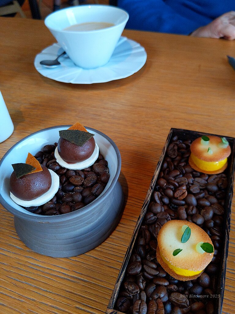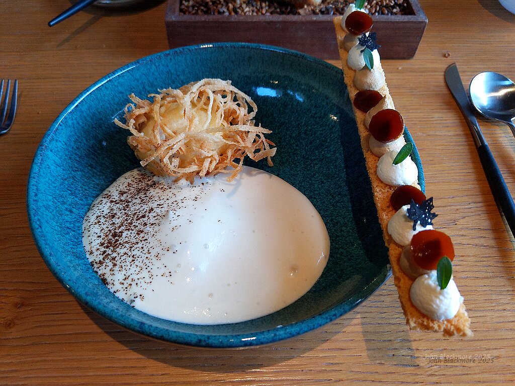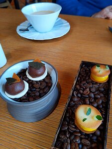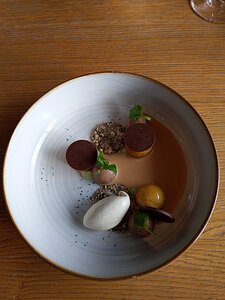 20221116_PXL131725306_Pixel3a-JEB chocolate, crème anglaise, pear, liqueur balls / quince biscuit
