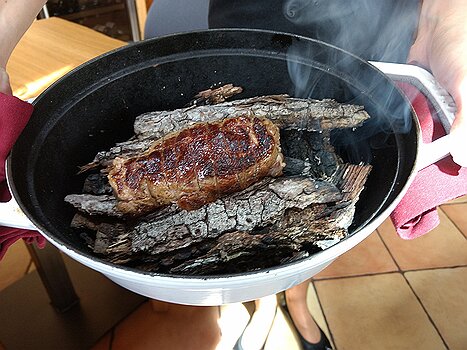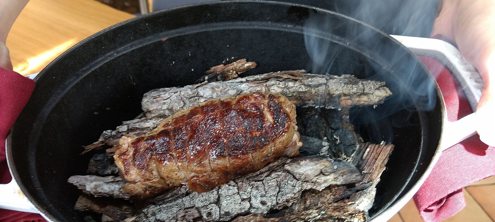 L'agneau rumsteak, aux écorces d'épicéa, cromesqui d'épaule, fèves, framboises, jus infusé d'aromates