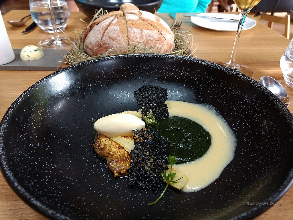 Le foie gras poêlé, chaud et froid, glace et velouté de maïs, condiment de lamier blanc (+ white nettle purée)