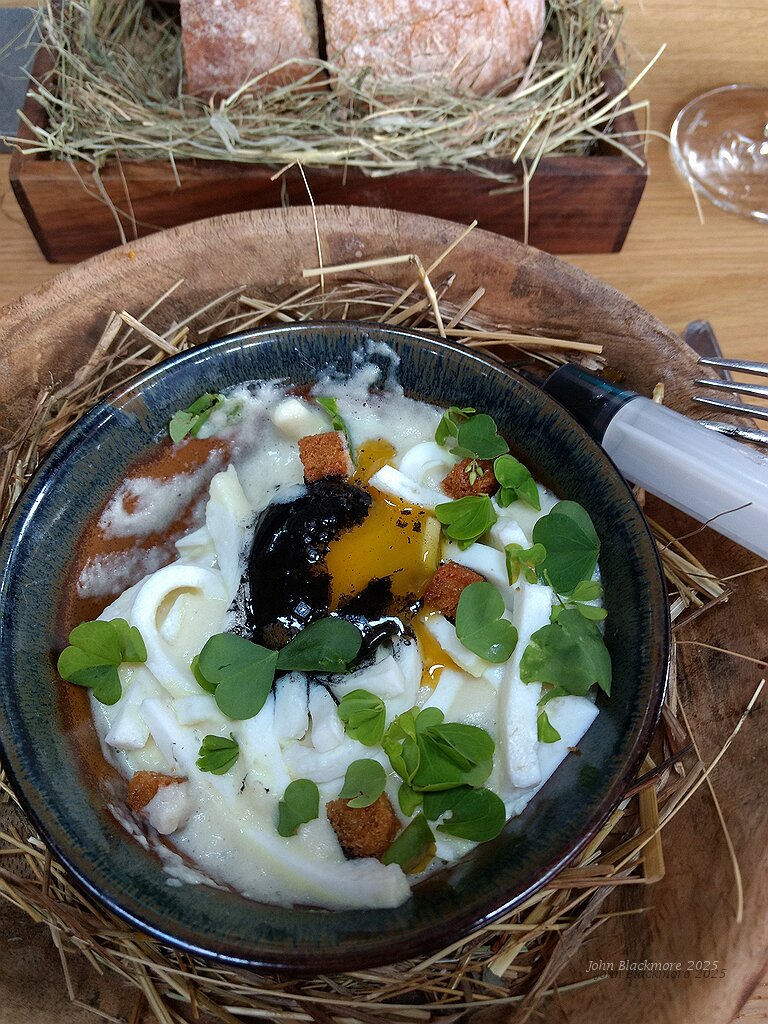 L'oeuf bio, tagliatelle de blanc, jaune confit, soubise, piqûre de cendre végétale