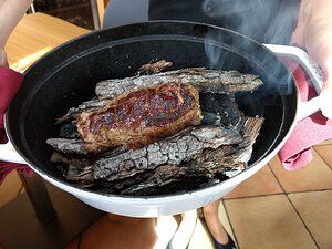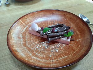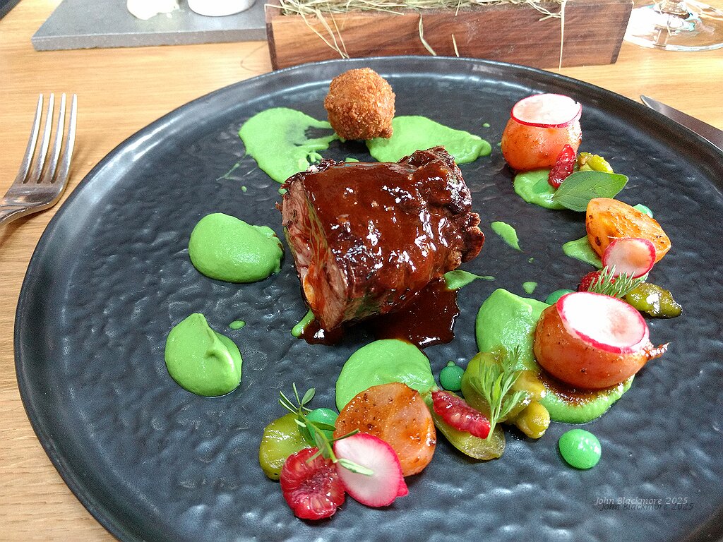 20180621_IMG134648956_MotoG4-JEB L'agneau rumsteak, aux écorces d'épicéa, cromesqui d'épaule, fèves, framboises, jus infusé d'aromates