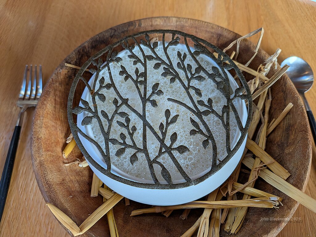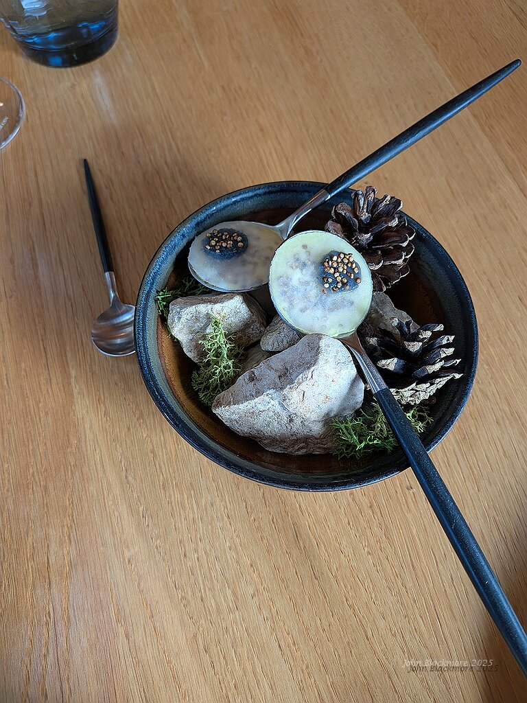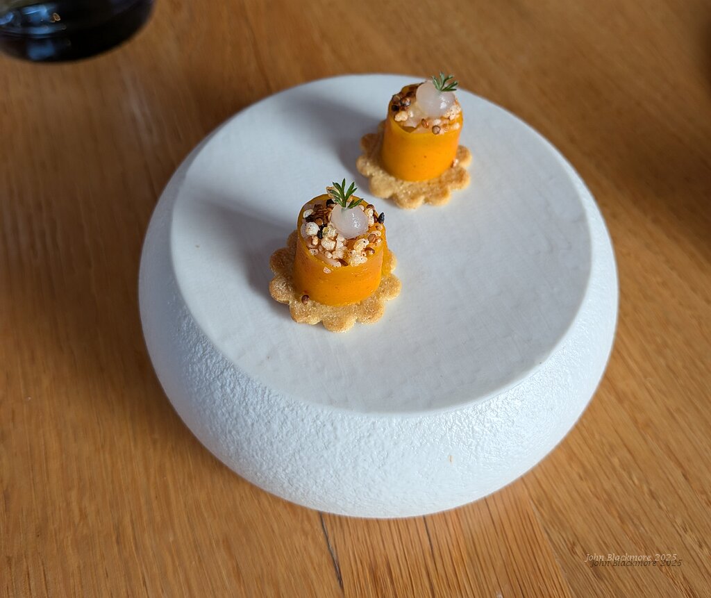 Amuse-bouche, balade hivernale: spicy courgettes with vervaine foam and egg yolk