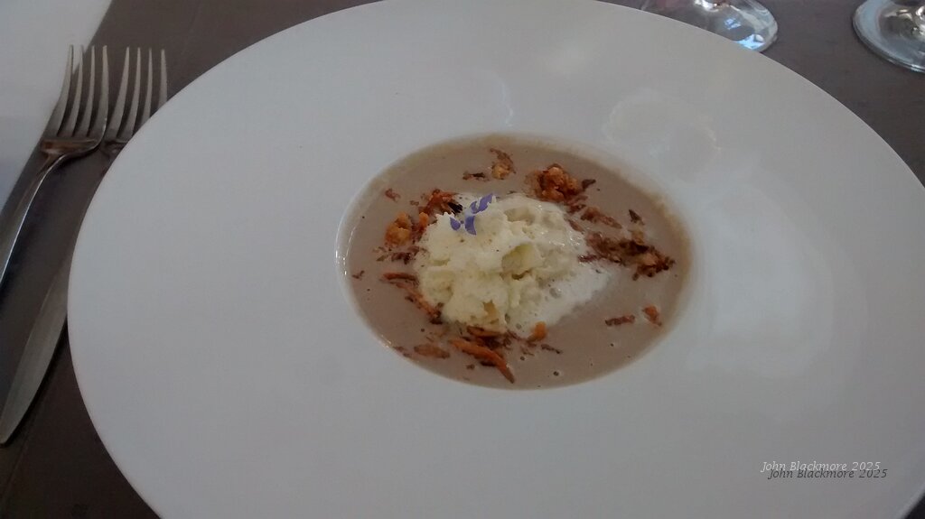 starter: Crème de champignons de Paris/ Ecume de lard fumé/ Oignons frits