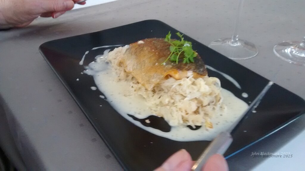 main: Filet de truite/ Choucroute sautée au cumin/ Emulsion au vin blanc