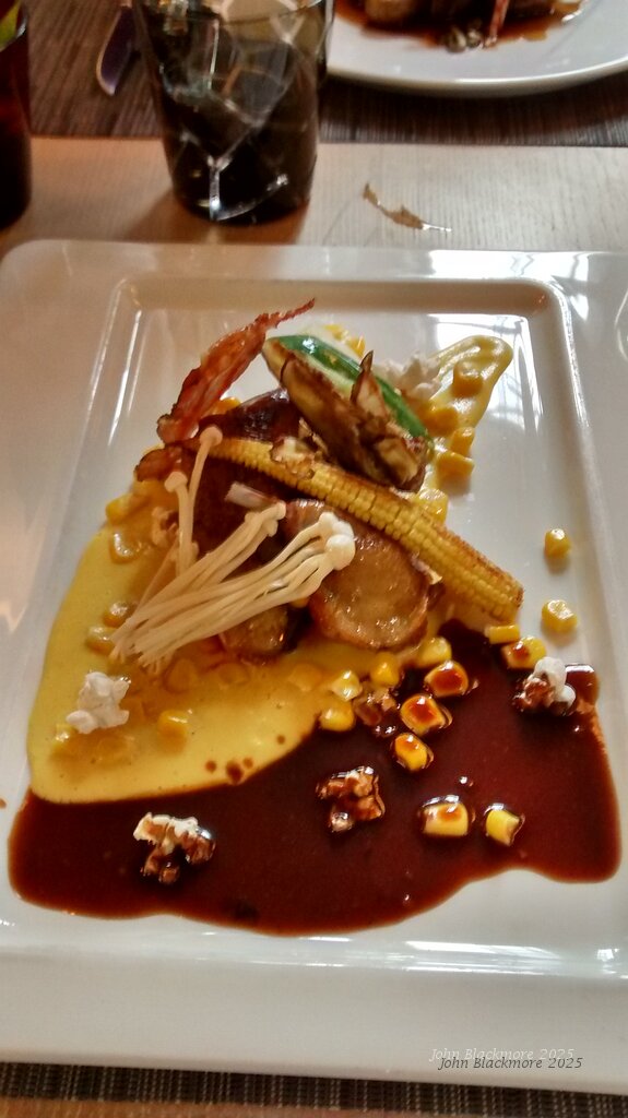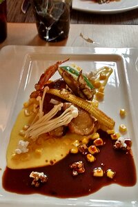 main: Suprême de pigeon rôti, émulsion de maïs et speck (Menu initiation) (the maize, in various forms, included popcorn)