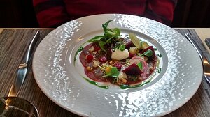 starter: Carpaccio de biche, betteraves et mâche, condiment yuzu/raifort (Menu de bouche à oreilles)