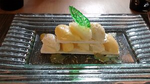 dessert: mango cream with lemon coating and coconut (Menu de bouche à oreilles)