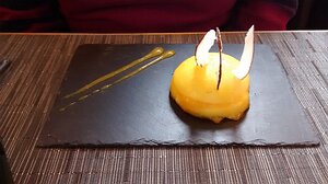 dessert: Lemon curd/wasabi et main de Bouddha, fines feuilles croustillantes de pomme safran (Menu initiation)