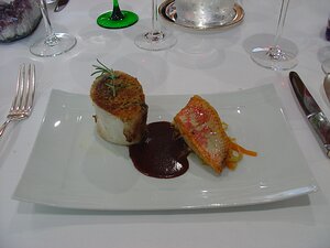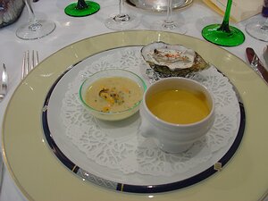 soupe de potiron ,une huître a la crème échalotée et une fricassée de moules
