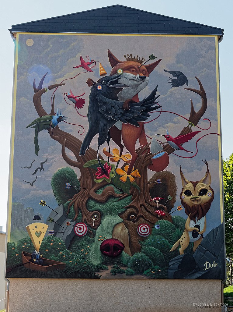 FRESQUE N° 11 by DULK OCTOBRE 2017 « LE RENARD ET LE CORBEAU » Spray et acrylique, Esquisse à main levée (cadrillage de motifs), 6 jours GPS 48.2991452, 6.94099569